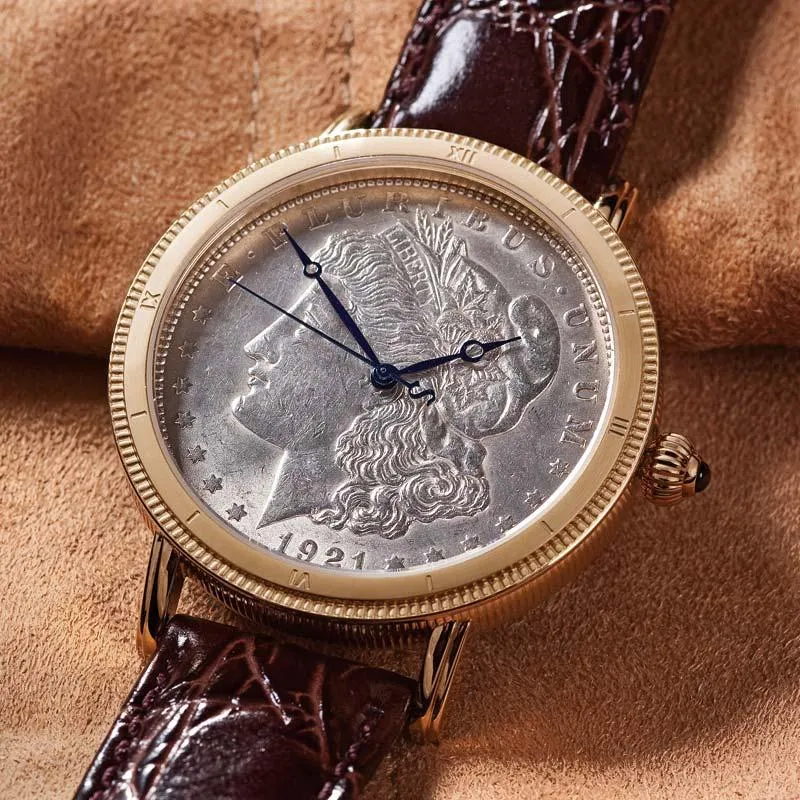 The Morgan Silver Dollar Watch features a genuine Morgan silver dollar that has been skillfully cut cross-sectionally, set inside a coin-edged case finished in luxurious gold. Master engraver George Morgan’s radiant profile of Lady Liberty provides a striking backdrop for the blued, Breguet-style hands. Etched Roman numerals along the edge of the dial and a sapphire crown add the final elegant touches. The Morgan Watch fastens with a brown, crocodile-grain leather strap and gold-finished buckle. Don’t miss this chance to secure your own limited-edition masterpiece.
