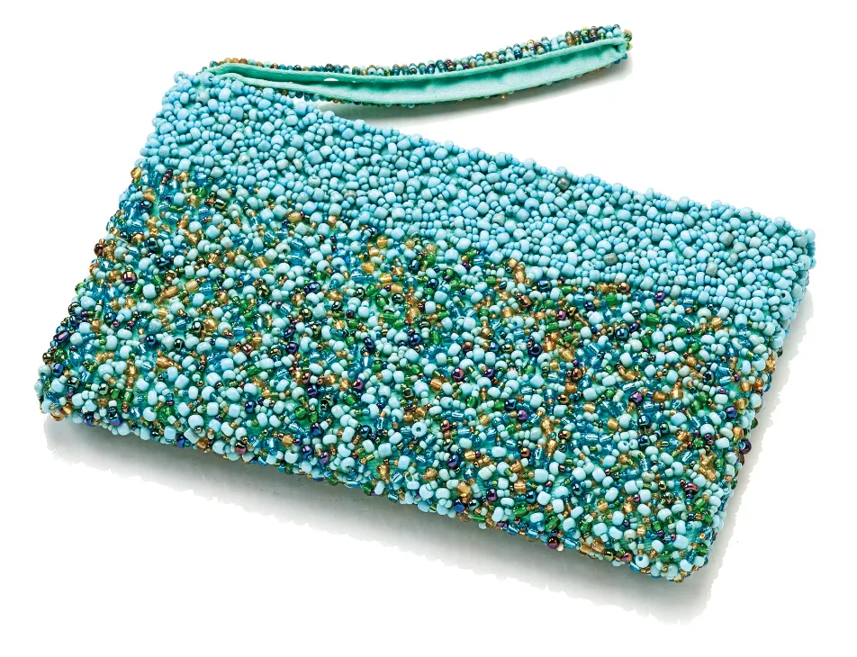Our Bequia Bead Clutch is a jackpot of Caribbean color, captured eloquently in cascading polished glass beads. Each handpicked bead glitters like a gemstone and creates a spectacular mosaic. Teal beads alternate with translucent golds, greens, violets and blues. The Bequias timeless design combines the look of ancient beaded luxury with the breezy, modern feel of a tropical getaway. Youll find its the perfect accessory for barefoot afternoons in paradise or high-heeled nights in the city. Pair it with the Bequia Beaded Necklace and the sensation of a perfect Caribbean morning is guaranteed to follow you everywhere.