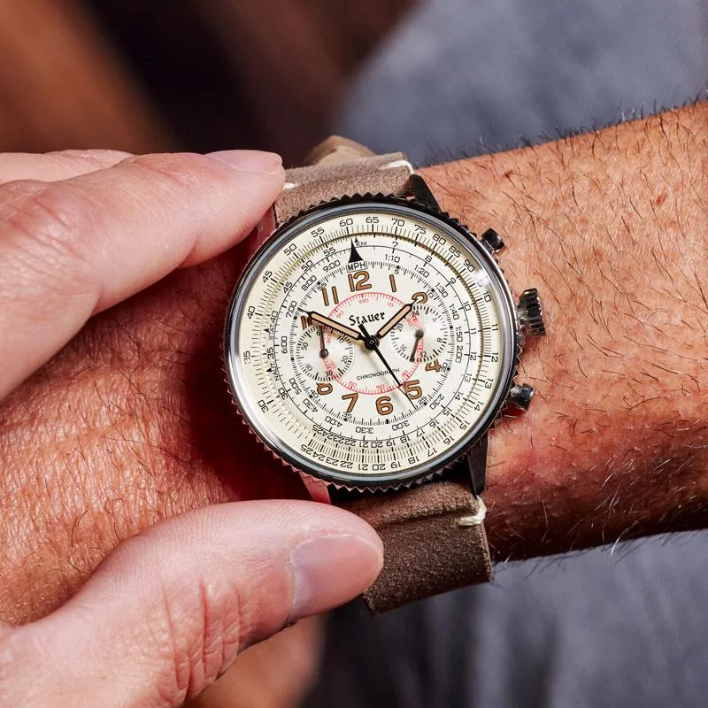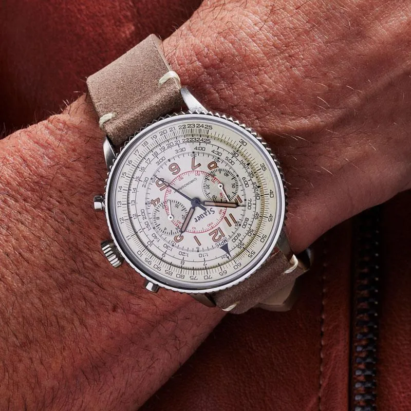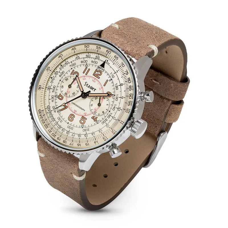 The Co-Pilot Men’s Watch is inspired by what was accomplished in the Battle of Britain. This classic aviation-style watch is not for the faint of heart. It features markings to calculate velocity, and a stylish sepia-toned dial carrying three classic complications: 24-hour at 3 o’clock and chronograph 60-minute at 9 o’clock. The Co-Pilot’s look is completed by a vintage-style distressed brown leather strap.