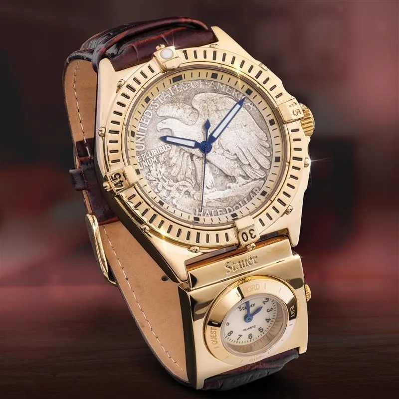 To celebrate this most American of coins, Stauer has crafted the Eagle Eye Dual Time Watch, featuring the reverse of a genuine Walking Liberty half-dollar that has been skillfully cut cross-sectionally to showcase the American Bald Eagle. Considered by art historians to be one of the most beautiful U.S. coins ever minted, Adolph A. Weinman’s artwork depicts the American bald eagle perched high upon a mountain crag, wings unfolded and fearless in spirit. From the rock springs a mountain pine sapling, symbolizing America.