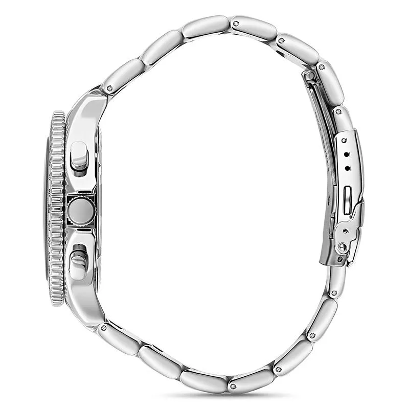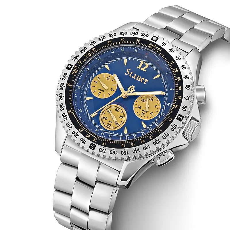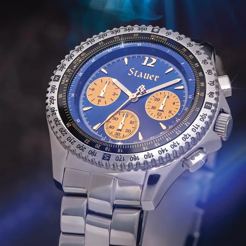 This is also one great-looking watch, with a blue face sporting contrasting brass colored numbering, and a gleaming stainless steel band. Tough? Oh it goes without saying, the Double Time has stainless steel construction and is water resistant to an impressive 10 meters.