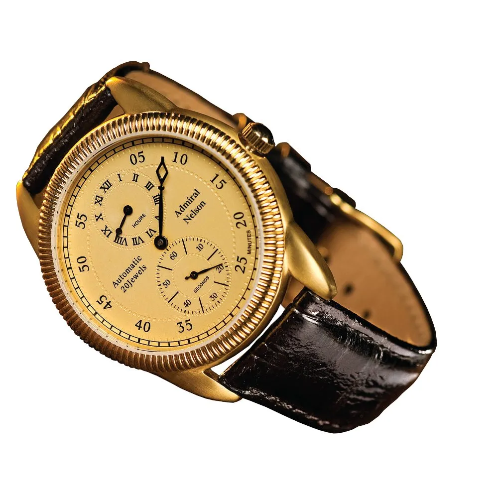 In the most decisive sea battle of the Napoleonic Wars, the French navy and its allies lost a total of 22 warships. The British lost none. During the Battle of Trafalgar in 1805, Britains Admiral Horatio Nelson became a national hero…but also lost his life. The Stauer Nelson Timepiece is modelled after the gold pocket watch found on Nelson after he was killed.