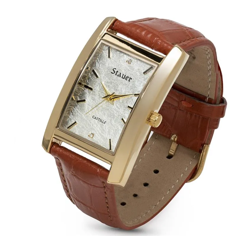 The Castille is the consummate gentleman’s statement of 1930s elegance and prestige, sparked with 21st-century invention. What makes the Castille so special? It’s the vintage simplicity and sleek curves, specially designed for a man’s wrist. It’s the highly polished gold finish over a rugged case. It’s the genuine Swarovski® crystals at 12 and 6 o’clock, meticulously crafted by the makers of the world famous Austrian crystal. And it’s the distinctive, gleaming dial of genuine white gold foil, hammered to stately perfection.