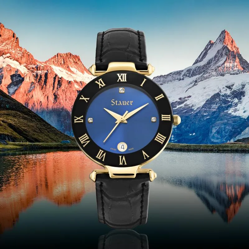 In honor of that perfect Alpine sky, we added sparkle to the metallic blue face with a trio of Austrian crystal rounds at the twelve, three and nine o’clock positions. Golden Roman numerals pop against the rich black of the outer dial and an easy-to-read date window sits at the six. The Stauer Minuit secures with a genuine black leather strap and gold-finished buckle. Even more impressive than its distinctive design is its non-designer price. And for a Swiss-made timepiece, thank your lucky stars. Fits wrists 6¾” – 8″.