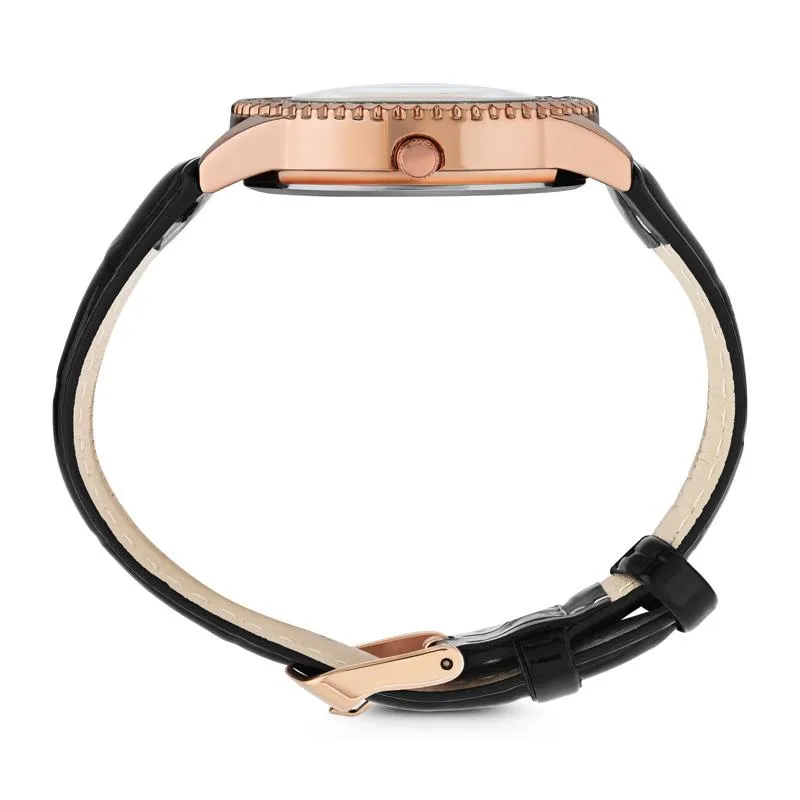 Sparkling European crystals set in a rose gold-finished bezel pair with a glossy band for romance with a touch of rebellion. And, there’s no doubt in an age of flux that these ladies had perfect timing, as does our watch with a precision movement designed to get you to your next engagement right on time, even if that means fashionably late.