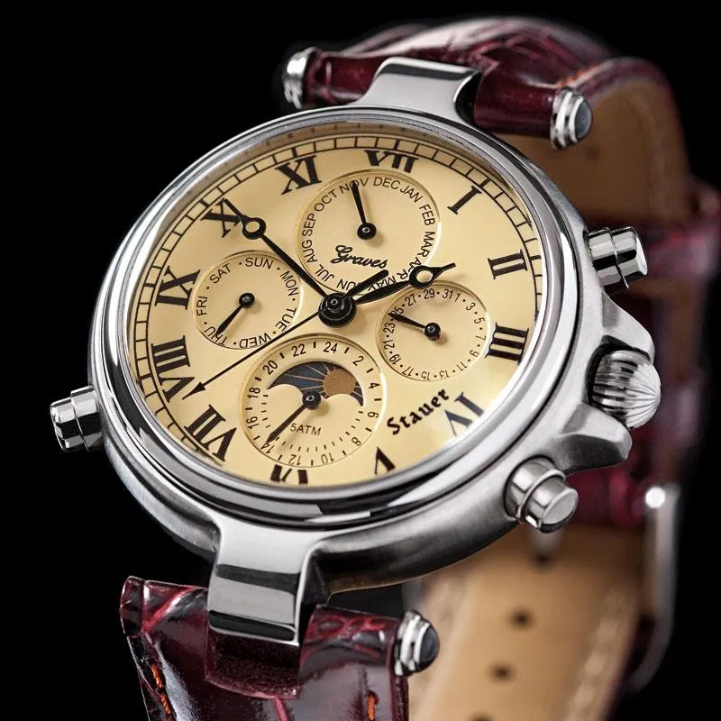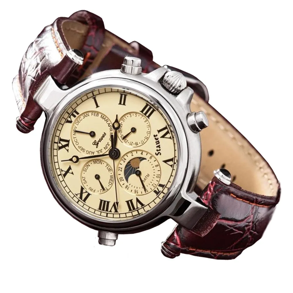 Business Week elucidated, “It’s the complications that can have the biggest impact on price.” (July 2003). Our Graves watch is no exception. Its four internal complications effortlessly display the month, day, date, and a 24-hour cycle showcasing the dance of the sun and the moon. Powered by the wearer’s movement, this watch is a testament to self-sustaining elegance, eliminating the need for batteries or manual winding. The seamless motion of the hands is facilitated by 27 embedded rubies.