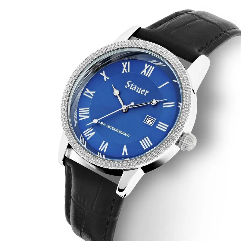 It’s everything a top quality watch should be: Sturdy with genuine leather construction. Precision timing. Durable CotswoldTM Crystal. And, good looking – with simple, clean lines and a striking metallic blue face.