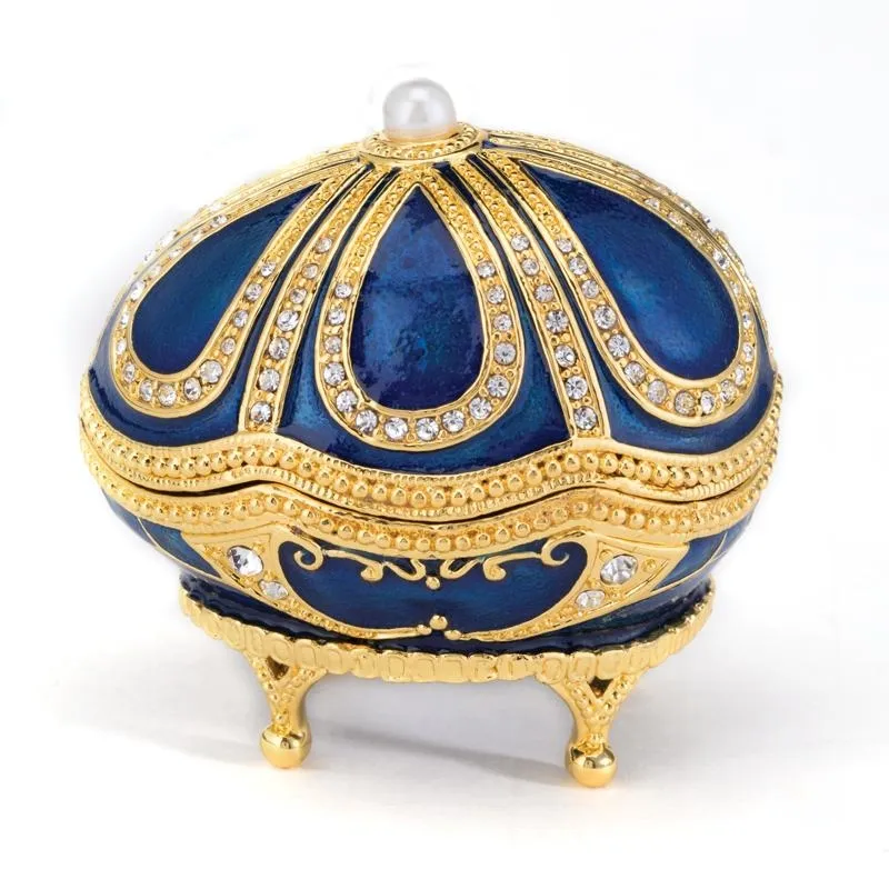 Put this one on the collectible menu. A miniature, fully functioning timepiece, housed inside a lavish egg, with a design inspired by one of history’s finest. In the late 1800s, a legendary jeweler to the Russian Tsar created a range of jeweled enamel egg pieces to delight the ruler’s wife. This collectible hand-painted enamel egg in royal blue is crafted using the same method as those famous Russian works of art, and is accented with sparkling Austrian crystals. The egg opens to reveal the clock inside, and delicately closes to keep the secret timepiece hidden.